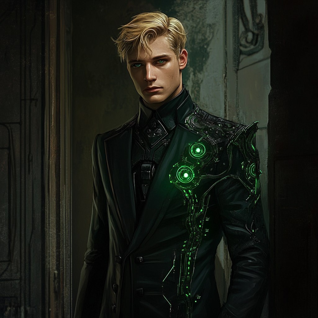 Создано на основе запроса: tall broad shoulders blonde corpo male short hair green eyes full body dark green cyberpunk formal dress
