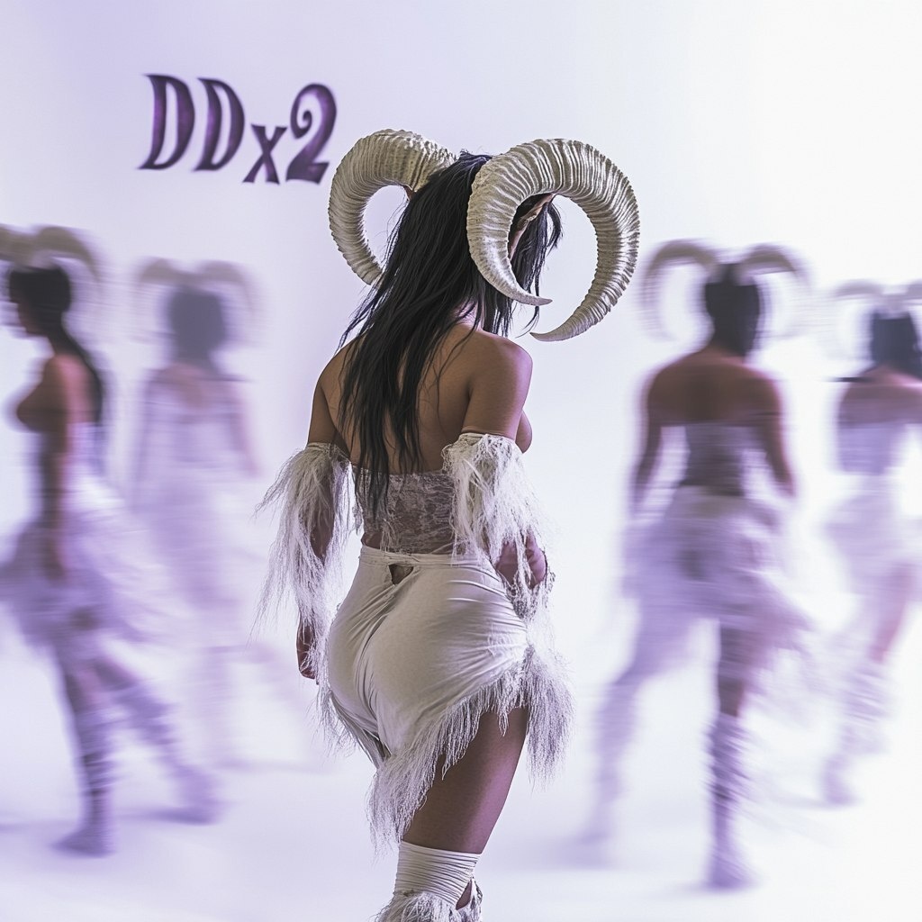 Создано на основе запроса: Studio photography, photorealism, realistic quality of a Mexican woman in her twenties, full body shot of a young very beautiful European black haired Mexican female demon with huge white horns, weared in white loincloth, dynamic motion pose, she looks away, in the background are several figures of female demons with horns with motion blur effect, minimalistic light purple and white background, write " DDx2 " in large Roman style