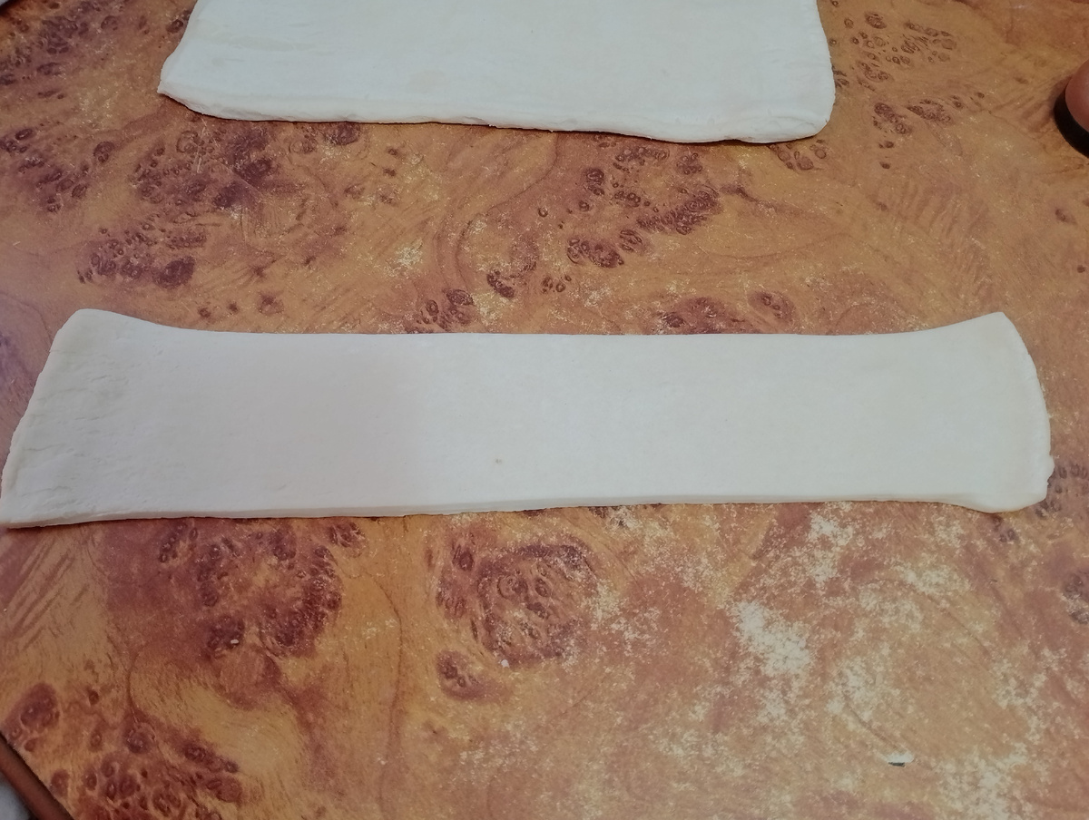 У меня слоенное дрожжевое тесто. Порезать на полоски и обматать сосиски. Положить на противень. Дальше сделаем вкусные розочки.На такие же полоски ложим тоненькую колбасу.