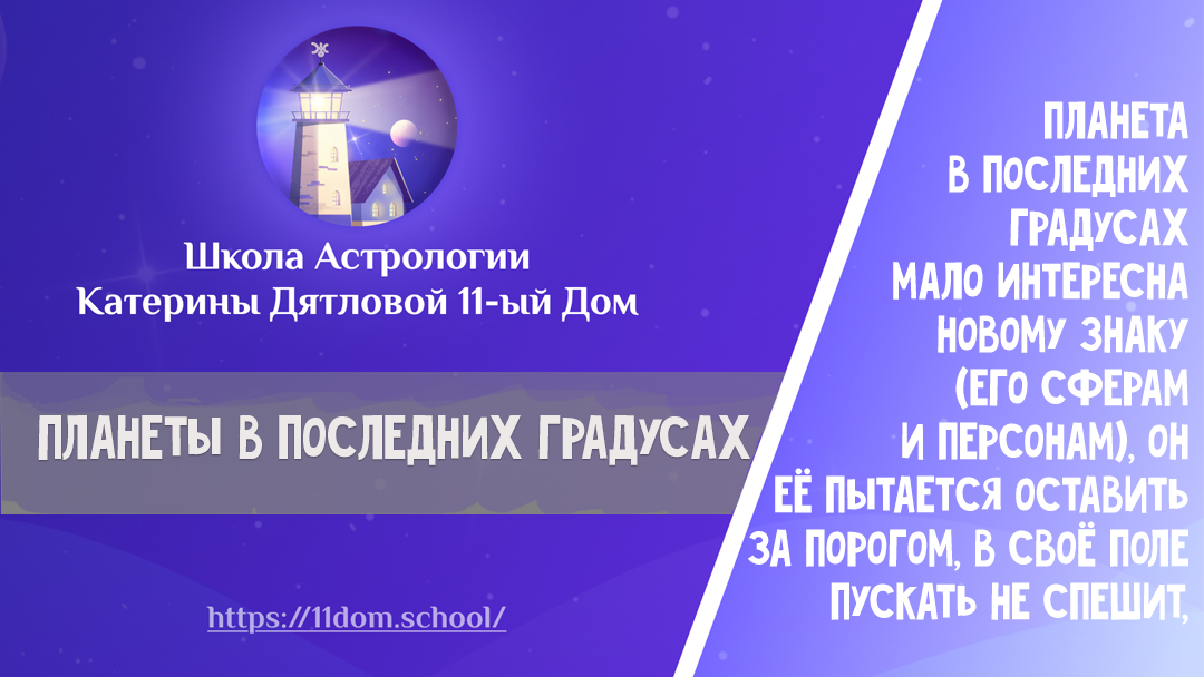 Планеты в последних градусах постоянно пытаются ворваться или прорваться в следующий знак, обивают пороги, ощущая себя на окраине или обочине жизни и стучась в закрытые двери, где будто что-то интересное происходит без них, а их там не ждут или вообще за порог гонят. Но после нескольких попыток, в итоге попасть туда всё же получается. Здравствуйте, я Катерина Дятлова основатель Школы Астрологии 11-ый Дом. На своем канале делюсь опытом и авторскими наработками, которые вы не найдете в других школах. Например, Ксения Собчак с Венерой в 30-м градусе Стрельца вначале пыталась продраться в закрытую конфиденциальную элитарную тусовку тяжёлого люкса через знакомство с Анастасией Волочковой (Козерог). Потом обивала пороги в политику (Козерог). Теперь проникает в душу и дома ко всяким закрытым известным людям (Козерог) в своих интервью. Нарушает границы. У Андрея Малахова Меркурий в Стрельце в последнем градусе, и он всё пытался попасть в руководство (Козерог) Первого канала, хотел, чтоб с его