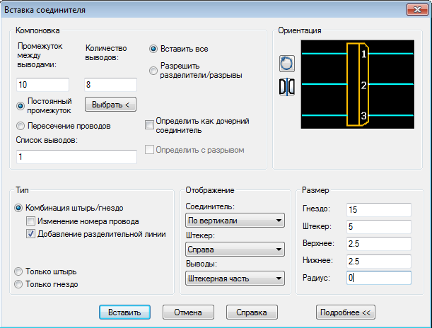 Чтобы полностью раскрыть диалоговое окно «Вставка соединителя» следует нажать кнопку Подробнее>>. Станут доступными опции разделов «Тип», «Отображение», «Размер». Опции раздела «Тип» Ниже приведены описания опций раздела Тип диалогового окна «Вставка соединителя»: · Комбинация штырь/гнездо - Создание соединителя со штыревой и гнездовой частями. Изменение номера провода– Изменение номера провода после соединителя. Если опция не активна, номер провода до и после соединителя не изменяется. · Добавление разделительной линии - Используется для создания соединителя с разделительной линией между штыревой и гнездовой частями. · Только штырь - Размещается только штыревая часть соединителя. · Только гнездо - Размещается только гнездовая часть соединителя. Опции раздела «Отображение» Ниже приведено описание опций раздела Отображение диалогового окна «Вставка соединителя»: · Соединитель - Из выпадающего списка выбирается размещение соединителя: по горизонтали или по вертикали (повторяет кнопку «По