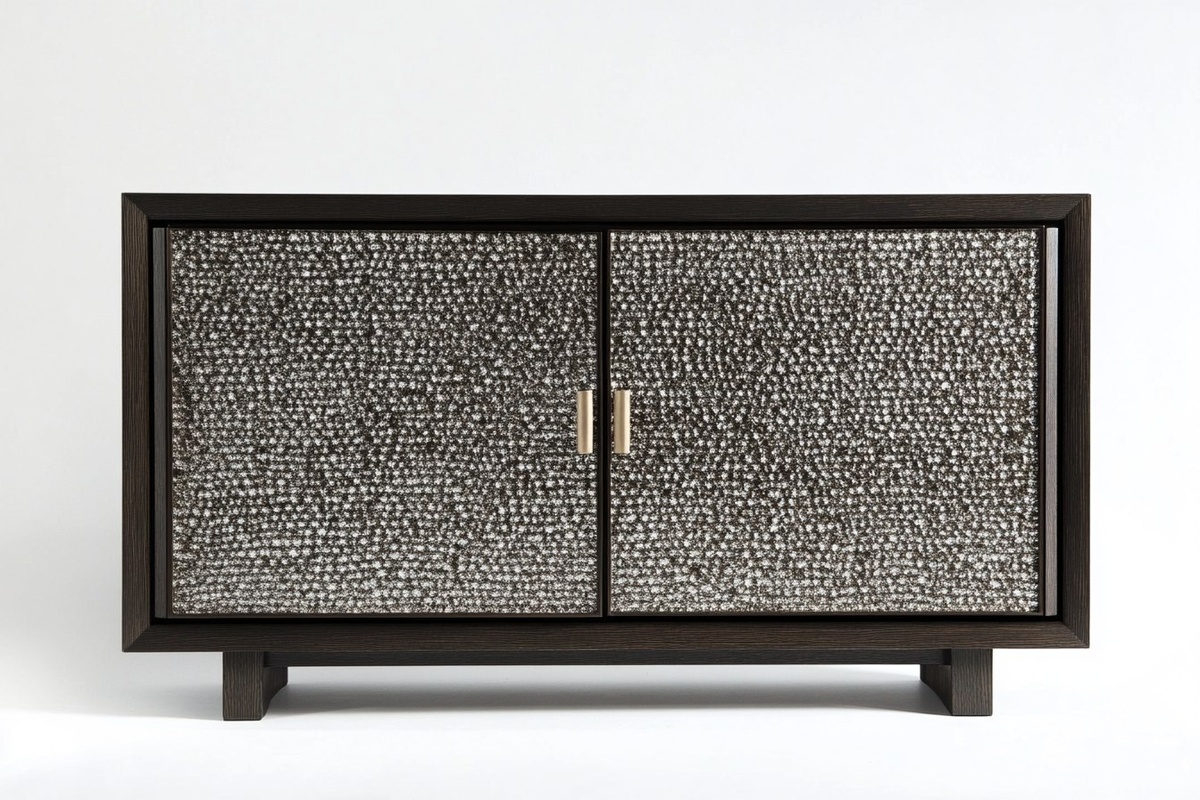 Создано на основе запроса: credenza, modern style with a mid century aesthetic, minimalist, dark walbut frame, 2 doors, front is bronze