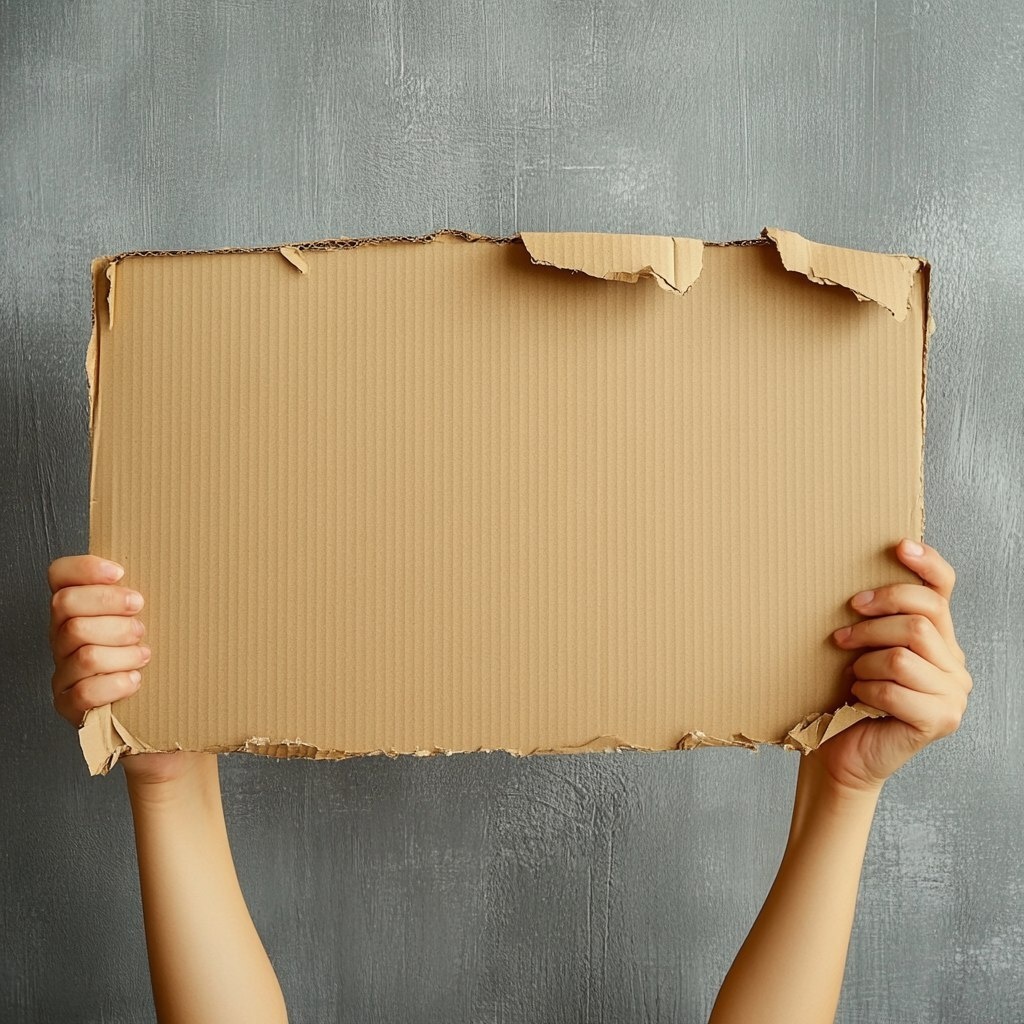 Создано на основе запроса: A pari fo hands holidng up a blank cardboard sign that is slightly ripped at the adges