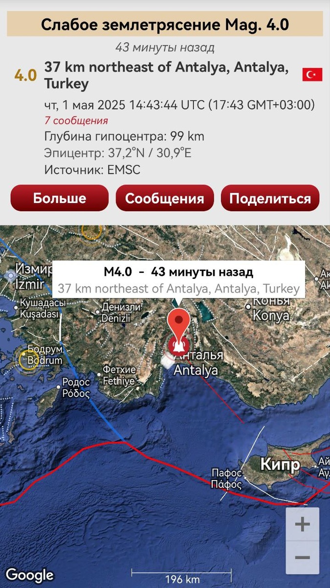 Ожидаемое землетрясение М4 произошло в отмеченной зоне через 3 дня после предупреждения. В Анталии его ощутили.