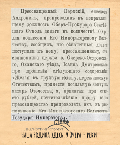 Епископ Пермский Андроник передал исполняющему должность обер-прокурора Святейшего Синода 100 рублей для поднесения Его Императорскому Величеству. Он сообщил, что деньги поступили от священника Иоанна Дмитревского из церкви села Очерско-Острожского, Оханского уезда, вместе с прошением следующего содержания: