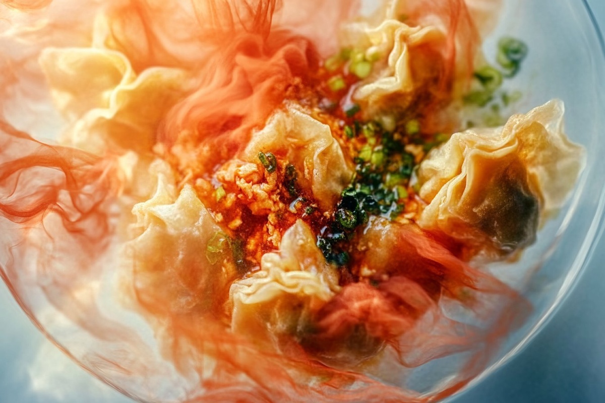 Создано на основе запроса: | Title: Chicken Wontons in Spicy Chili Sauce | STYLE: Close-up Shot right view | EMOTION: realistic as possible | SCENE: KEYWORD | TAGS: High-end food photography, clear composition, mouth-watering, indulgent, gourmet, cuisine, recipe | CAMERA: Nikon Z7 | FOCAL LENGHT: soft direction light | PRODUCTION : food stylist | TIME : daytime | LOCATION TYPE : kitchen near windows,
