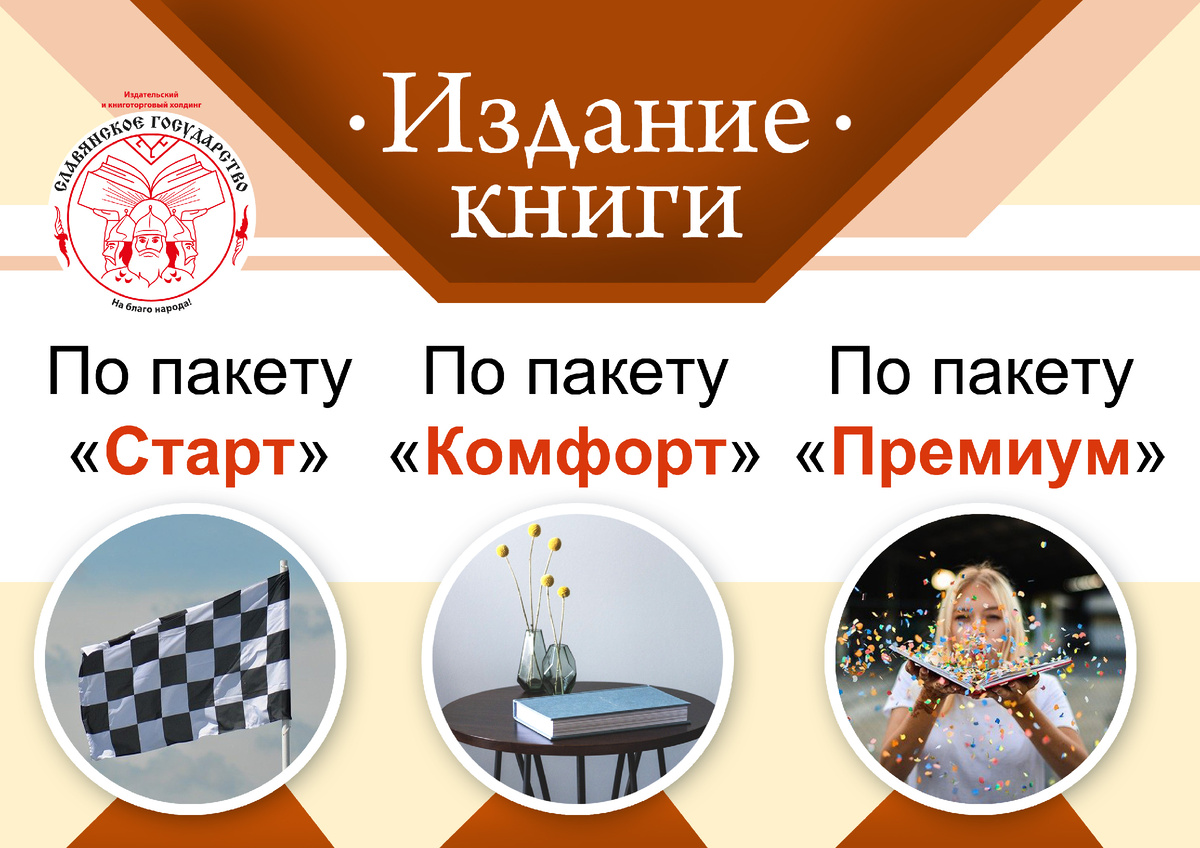 Издательский и книготорговый холдинг «СЛАВЯНСКОЕ ГОСУДАРСТВО» предлагает Издание книги по пакету «Старт» Общие положения: • формат: А5 (148x210) • кол-во страниц: 28 • бумага на блок: offset, 80 • красочность блока: чб (1+1) • переплет: мягкий (скрепка) • ламинация: ub-matt • красочность обложки: цветная (4+0) • тираж: 30 Издание книги по пакету «Комфорт» Общие положения: • формат: А5 (148x210) • кол-во страниц: 48 • бумага на блок: offset, 80 • красочность блока: чб (1+1) • переплет: мягкий (КБС) • ламинация: ub-matt • красочность обложки: цветная (4+0) • тираж: 50 Издание книги по пакету «Премиум» Общие положения: • формат: А5 (148x210) • кол-во страниц: 100 • бумага на блок: offset, 80 • красочность блока: чб (1+1) • переплет: мягкий (КБС) • ламинация: ub-matt • красочность обложки: цветная (4+0) • тираж: 100 Подробная информация: https://slav-gos.ru/izdanie-knig-po-paketam/