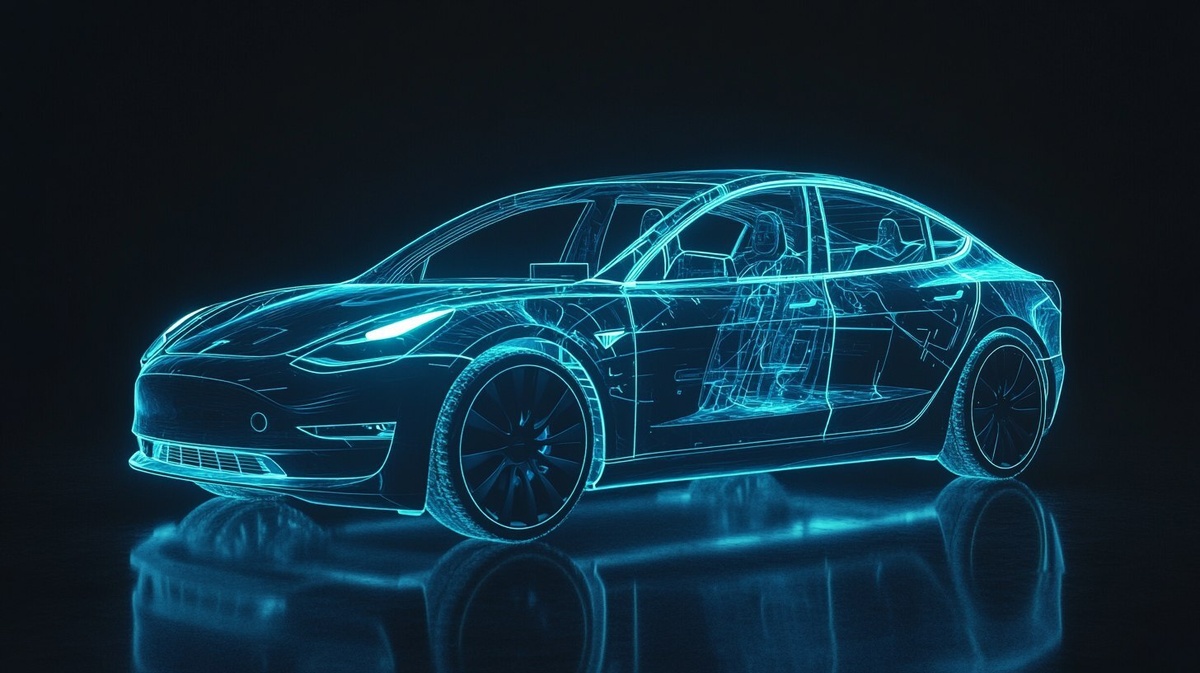 Создано на основе запроса: In a transparent blue light, there is an outline of a side profile tesla car through which X-ray laser beams
