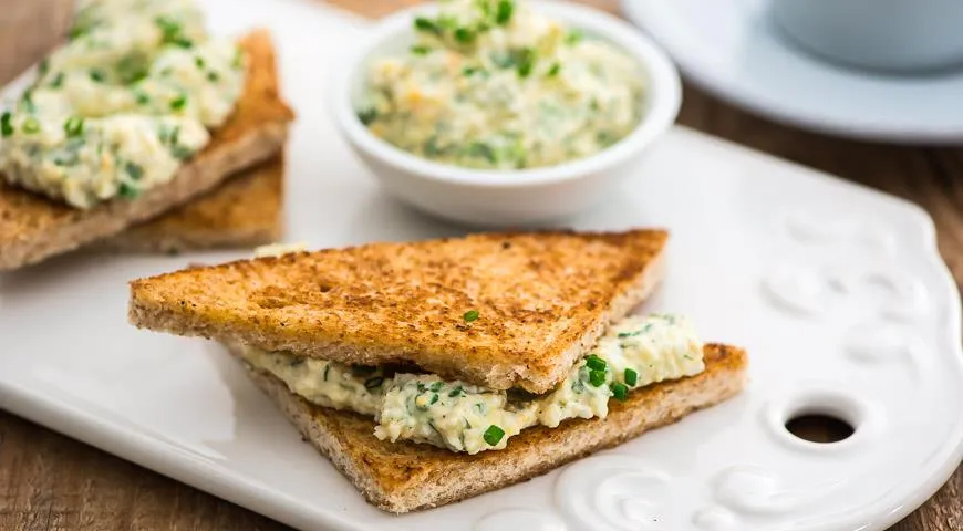 Яйца нарежьте кубиками или разомните вилкой. Добавьте мелко нарезанный зеленый лук и измельченные листья тархуна. Влейте ложку сметаны или йогурта, приправьте солью и свежемолотым перцем. Хорошо перемешайте — начинка готова! 3. Подготовка хлеба