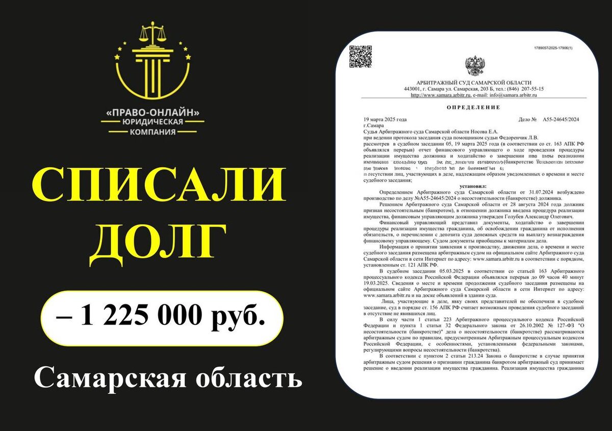 Минус 1 225 000 ₽ долгов всего за 7 месяцев и 22 дня — и наш клиент опять дышит полной грудью! 📜 Как это произошло? Мы взяли на себя всю бумажную волокиту, грамотно выступили в суде — и человек официально стал банкротом. Кредиторы теперь в прошлом: 🏦 Банки: ПАО Сбербанк, АО «Альфа-Банк», ПАО «Совкомбанк», АО «ТБанк» (экс-«Тинькофф»), ПАО «МТС-Банк» 💸 МФО и МКК: ООО МКК «Денежная крепость», ООО МФК «МигКредит», ООО МФК «Экофинанс», ООО МФК «Срочноденьги», ООО МКК «Триумвират», ООО МФК «Саммит», ПАО МФК «Займер», ПАО МФК «ЦФП», ООО МКК «ДЗП-Единый», ООО МКК «СМСФИНАНС» (бывш. «4финанс»), ООО МФК «Лайм-Займ», ООО МКК «Академическая» 🕊 Что в итоге? Долги обнулились — на горизонте чистый финансовый лист и спокойный сон. 💬 Тяжело с платежами? Не тяните — поможем списать задолженность, закрыть исполнительные производства и выключить коллекторский стресс. 📩 Хотите помочь друзьям / родным? Рекомендуйте нас — и получайте 10 000–15 000 ₽ за каждого клиента. Жизнь без долгов это реальнос