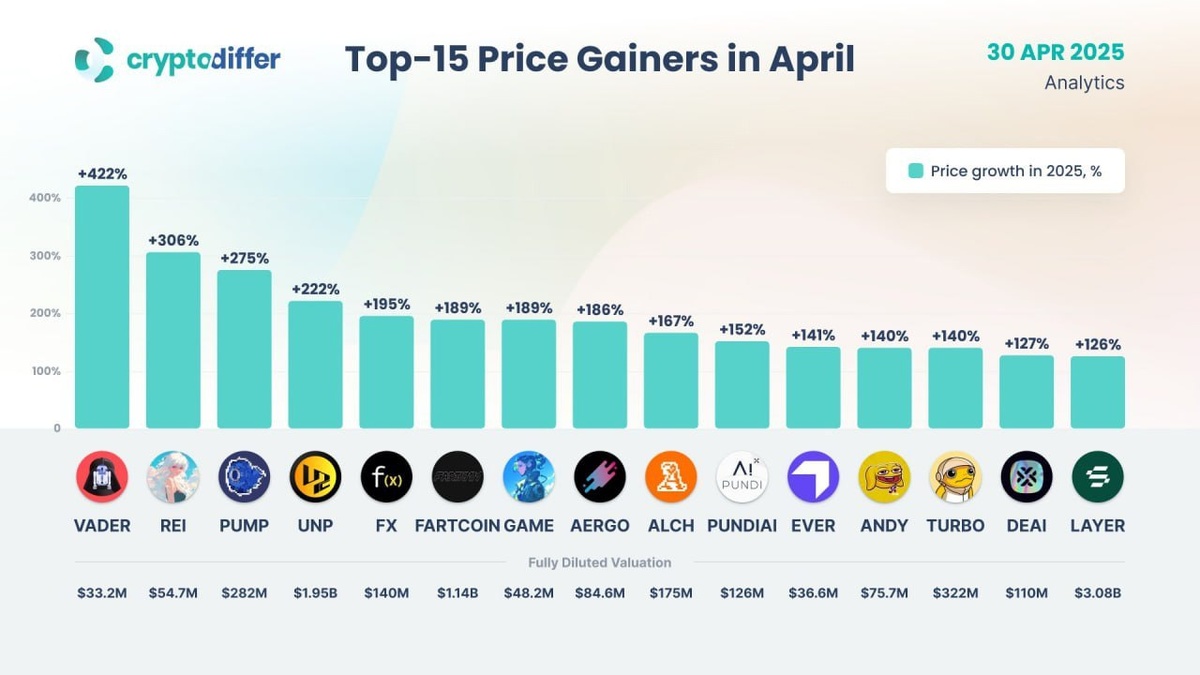 🔼 Топ-15 монет по росту в апреле Мемкоины все еще продолжают точечно стрелять на текущем рынке, несмотря на спад общего хайпа. Кстати, в список забыли внести токен ALPACA, который за несколько дней сделал x50 — впечатляющий результат на фоне остальных 😳