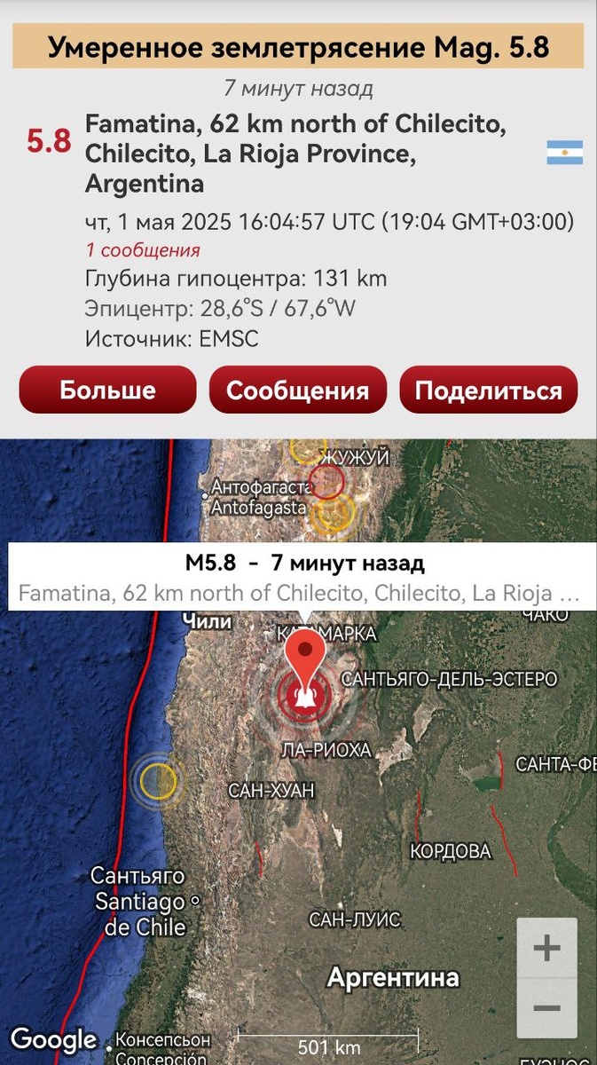 Согласно сегодняшнему предупреждению зона отработала землетрясением М5.8, но не в Чили 🇨🇱, а в Аргентине 🇦🇷
