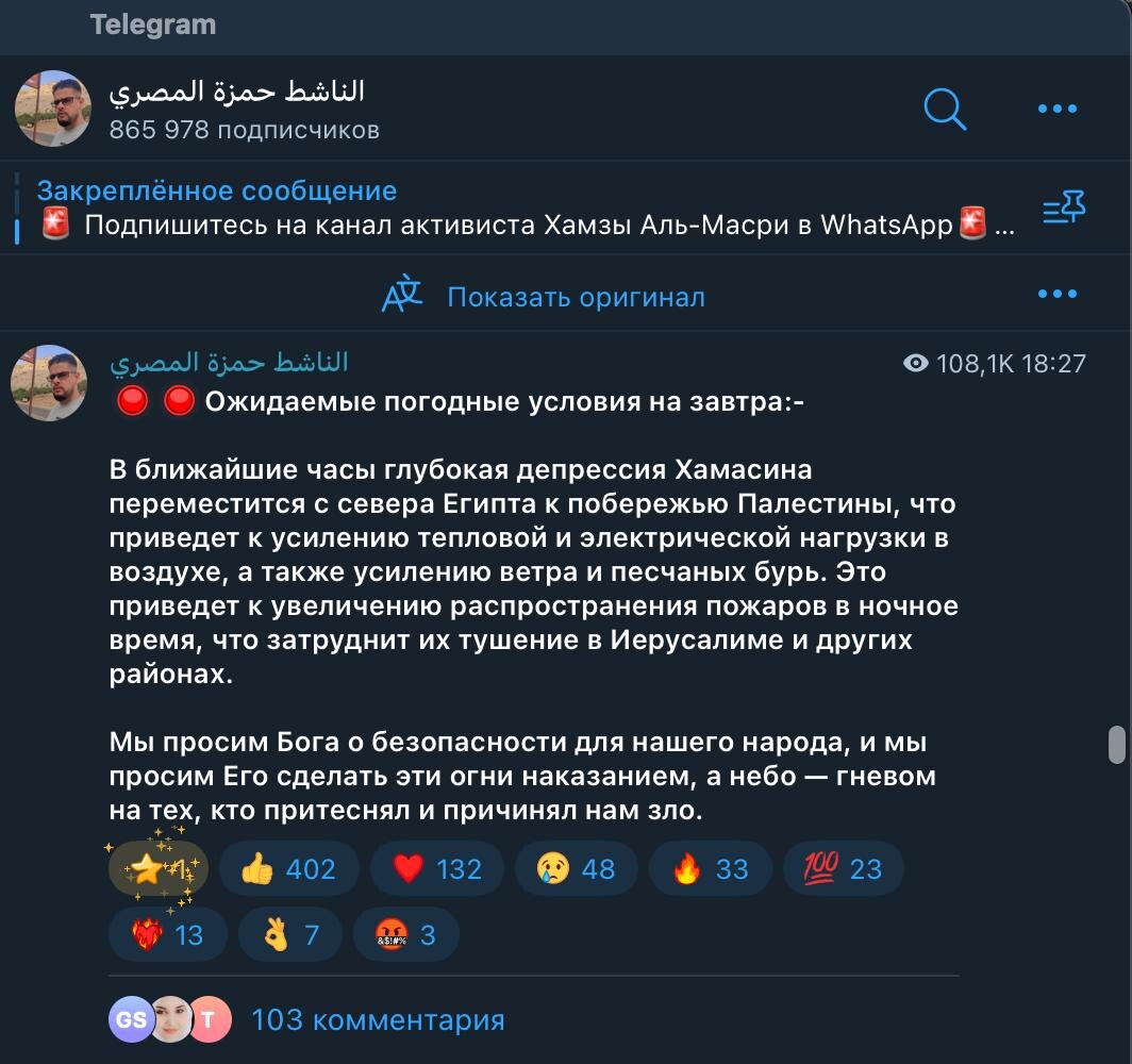 А это вчерашний пост в одном очень популярном палестинском канале. Просят спасти их от пожаров и хамсина и наслать эти все невзгоды на нас. Удивительные все-таки люди. Будто мы на разных планетах живем.