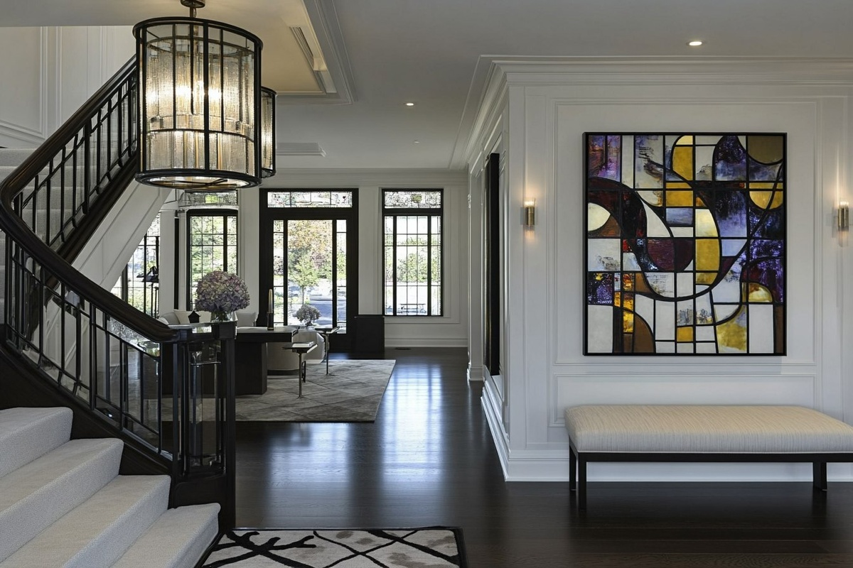Создано на основе запроса: living room and hallway, hallway console, wall mirror, table lamp, fabric bench, there is an entry way is not