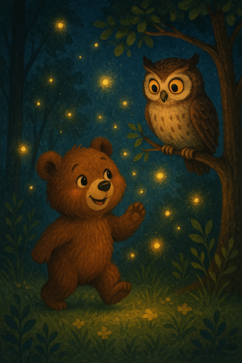 "Ой-ой-ой!" — Тимка прятался в норку и дрожал. Ему казалось, что темнота — это огромное море, где плавают страшные Тени-Бубуны. Однажды, когда Тимка особенно сильно испугался, к нему прилетел старый филин Филимон — самый мудрый в лесу. — Ух-ух! — сказал он. — Я знаю секрет, как превратить страх в волшебство. Хочешь, научу? 1️⃣ СВЕТЛЯЧКОВЫЙ БАЛ