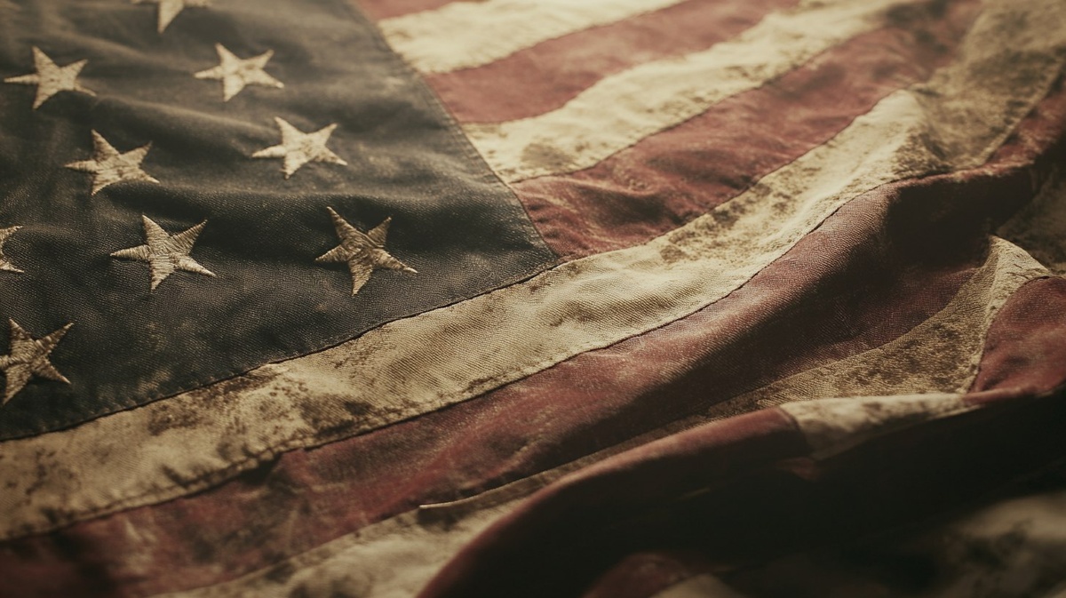 Создано на основе запроса: vintage American flag waving in soft light, aged fabric texture, worn and weathered look, sepia tone with