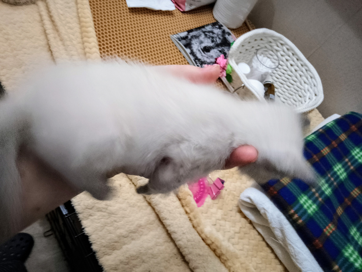 Мы когда в клинику ездили, как раз брали туда Ванечку и Митю. Ну, кто рандомно попался под руку, того Лариса и взяла. Забавно: взвесили котят — оба по 650 граммов. Ровно идут. Но светленький Митя, он же Дим Димыч, выглядит крупнее и круглее как-то. И ещё темпераментнее, как настоящий Митя Карамазов. В клинике и поскандалить успел, возражал, когда мазки брали, и удрать пытался. Нереальный красавчик колор-пойнт будет. У него уже сейчас очень контрастные ушки, маска и хвостик. И, наверное, глаза, останутся голубыми.