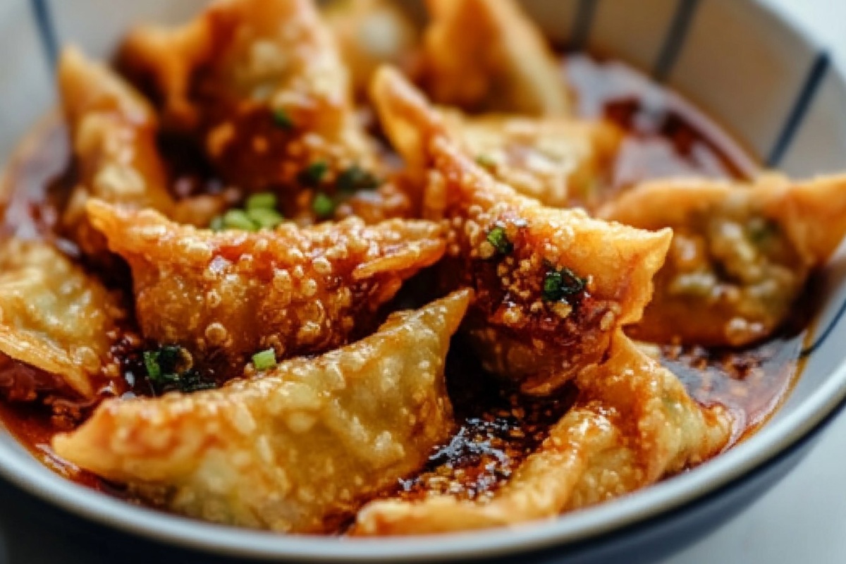 Создано на основе запроса: | Title: Chicken Wontons in Spicy Chili Sauce | STYLE: Close-up Shot right view | EMOTION: realistic as possible