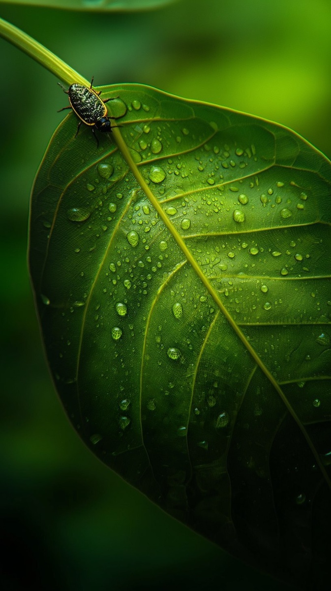 Создано на основе запроса: close-up of a leaf with a small insect crawling, soft sunlight, edges of the leaf visible