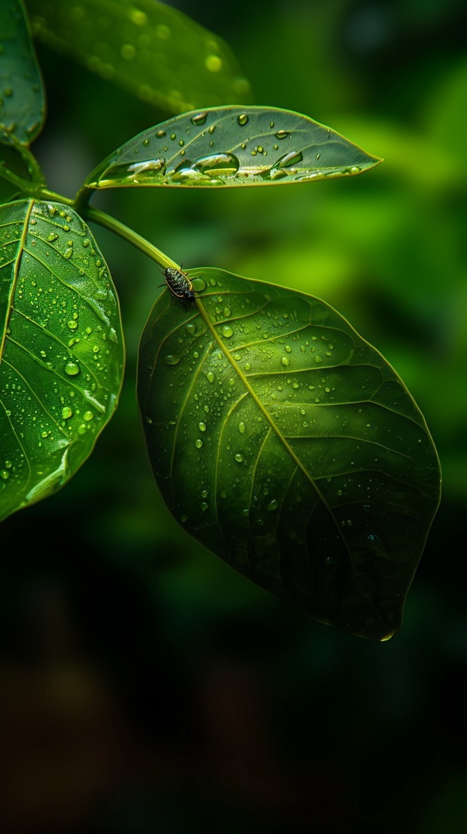 Создано на основе запроса: macro view of a few leaves on a small branch, early morning light, soft bokeh background