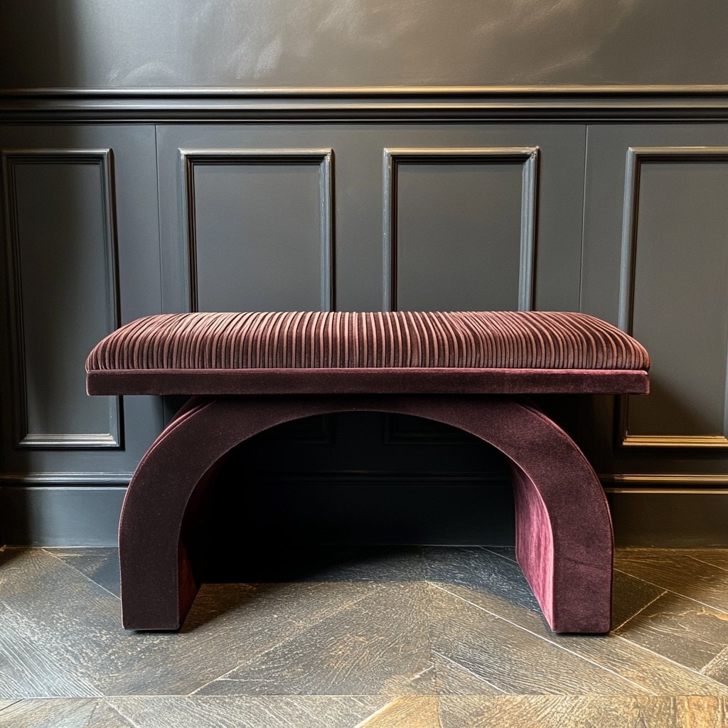 Создано на основе запроса: arched bench, marron vintage striped velvet cushion, te base is arched and dark bugundy