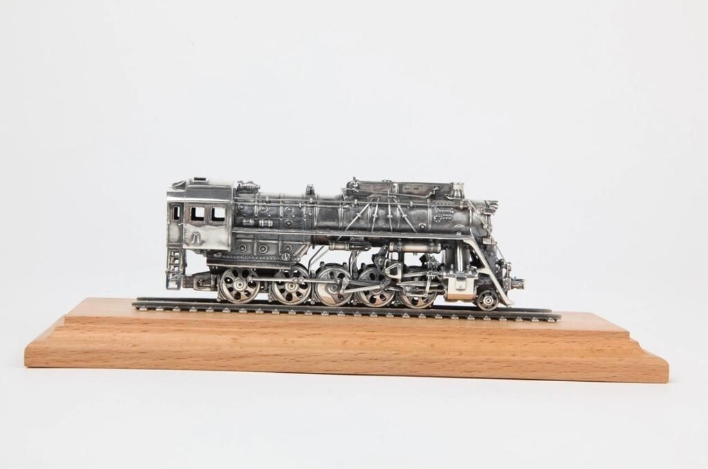 Паровоз серии Л, из серебра Паровоз серии Л, серебро Представляет Вам новое творение Скульптурной мастерской Игоря Коломийченко – серебряную фигуру промышленного паровоза серии Л На его изготовление у мастеров-ювелира ушло 110 часов ручного труда. По красоте и деталям паровоз не уступает своему стальному товарищу, выполнен в единственном экземпляре для подарка партнёру РЖД. Паровоз Л (Л — в честь Л. С. Лебедянского; до 1947 года — П — «Победа»; заводское обозначение — П32 — паровоз 32-го типа) — советский магистральный грузовой паровоз типа 1-5-0, разработанный в конце Великой Отечественной войны совместно Коломенским заводом и ВНИИЖТ под руководством конструктора Л. С. Лебедянского и академика С. П. Сыромятникова, и выпускавшийся с 1945 по 1955 год. Серебро, 2010 Стоимость лота: 120 000,00 ₽ Подробнее на нашем сайте