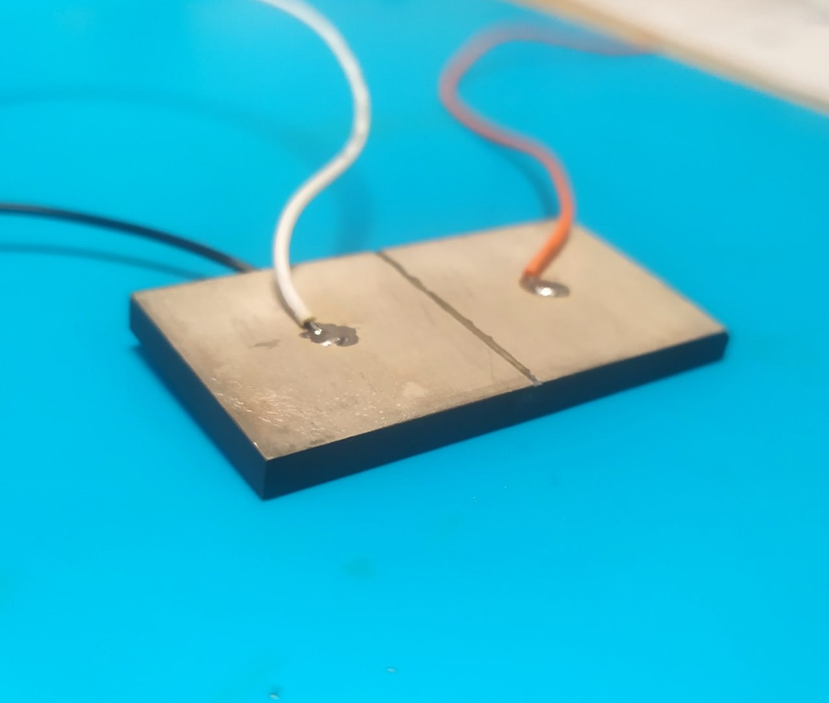 Немного помучил пластинку из пьезокерамики в надежде получить искомый принцип движения толкателя. Этот вид актуаторов работает на резонансе пластин, который в свою очередь вызывает циклическое и направленное по вектору силы движение толкателя. Материал примененной пластины ПКВ-460, характеризуется высокой механической добротностью, соотношения длины и высоты пластины 2 к 1. АЧХ показала целую пачку резонансов в на участке 50-100кГц, но вероятнее всего не каждый из них дает нужную конфигурацию колебаний. Должен образоваться резонанс сразу двух волн от длины и высоты пластины, координаты X и Z. Я получил интересный сигнал при частоте возбуждающего сигнала чуть более 70кГц. Сигнал синего луча состоит из двух частот относящихся как 1 к 2, что возможно является искомым режимом, но вовсе не обязательно. Проблемой оказалось как сделать надежный толкатель так и приклеить его. Я использовал тот же пьезоматериал для толкателя и эпоксидную смолу, а затем проверил суперклей, оба варианта отвалилис