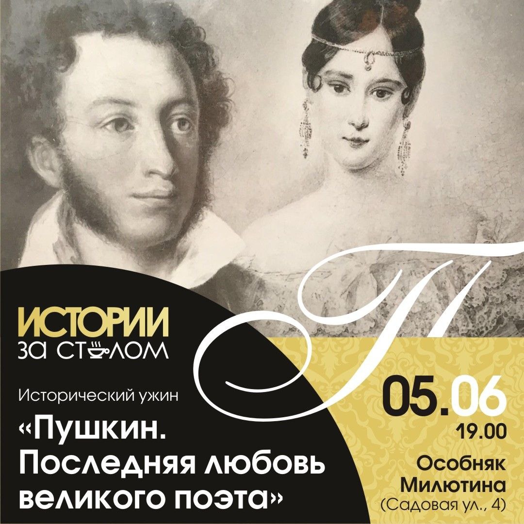 К Дню рождения А. С. Пушкина✍️ Музыкально-поэтическая программа «Пушкин. Последняя любовь великого поэта» 🗓5 июня в 19.00 Особняк Милютина (Садовая ул., 4) Мы представим вам историю любви Александра Пушкина и Натальи Гончаровой. До сих пор она рождает дискуссии среди литературных критиков и исследователей: ☑️она по-настоящему любила поэта или была к нему холодна? ☑️почему Пушкин решился на дуэль ради неё и что происходило в их семейной жизни? В программе - поэзия и русские классические романсы 19 века, таких композиторов как А. Алябьев, А. С. Даргомыжский, М. Глинка, А. Гурилев, А. Варламов, А. Верстовский и др. в исполнении лауреатов и дипломантов всероссийских и международных конкурсов Юлии Симоновой и Марии Марковой. В меню - блюда, связанные с поэтом: 1⃣Оливье по-царски с говядиной, раковыми шейками, красной икрой; 2⃣Котлета Пожарская с запеченым молодым картофелем; 3⃣"Весь ваш яблочный пирог"; 4⃣Бокал игристого вина; 5⃣Чай/кофе на выбор. Стоимость - 6490 рублей. Запись @An