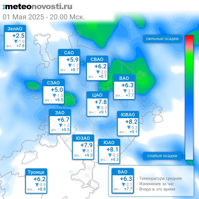 В 20:00 в Москве было от +2.4°C до +8.6°C, средняя температура +6.5°C #погода #Москва #весна #температура #1мая #четверг