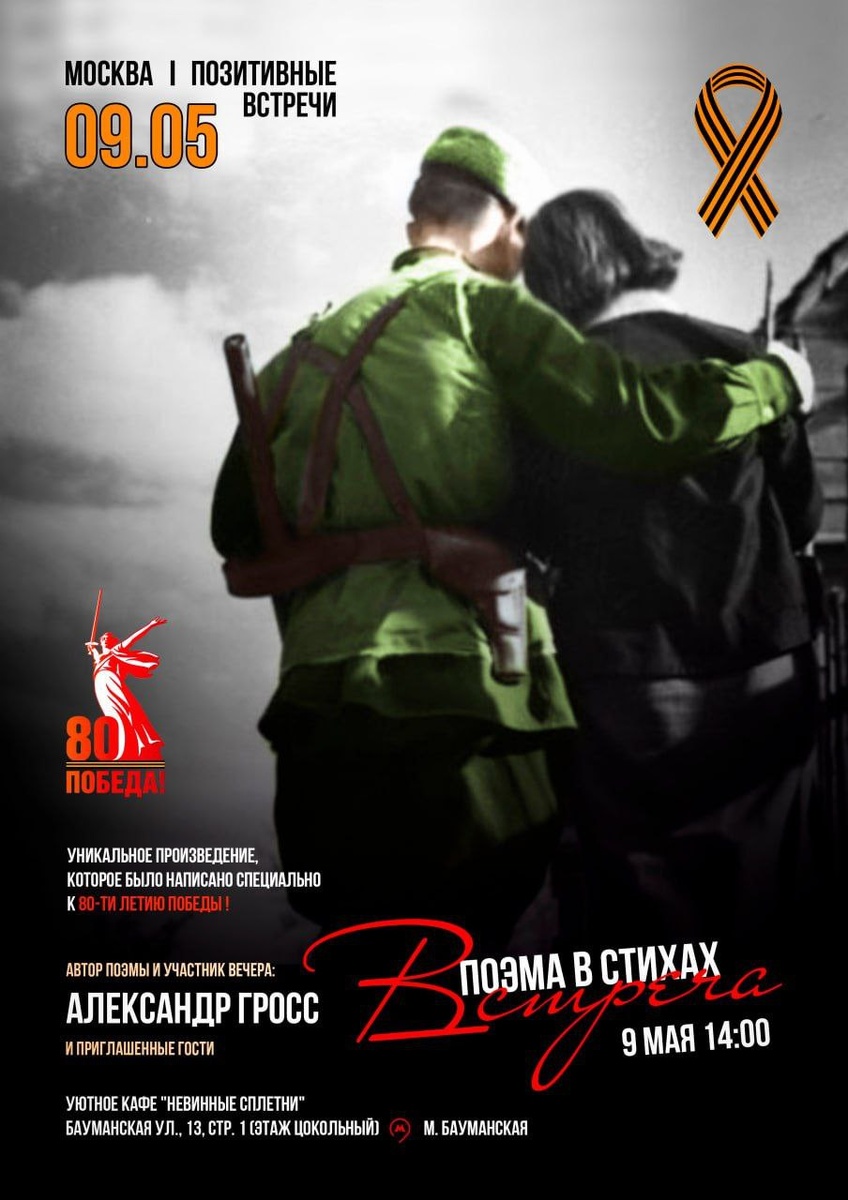 🔈 Дорогие друзья! ✨ К 80-ти летию Победы! Ветеранам посвящается! 09.05.2025г. в 14:00 - поэма в стихах "Встреча", читает автор поэмы Александр Гросс. ✔️Организуем памятный уголок Бессмертного полка (приносите фотографии) ✔️Почтим память минутой молчания ✔️Споем военные песни Принимают участие приглашенные гости - Никита Дубровина Мероприятие будет проходить в уютном кафе "Невинные сплетни", ул. Бауманская, д.13, стр. 1 (этаж цокольный) м. Бауманская. ✨ Для наших подписчиков есть 20 свободных мест! У кого есть желание, напишите здесь в комментариях ⤵️