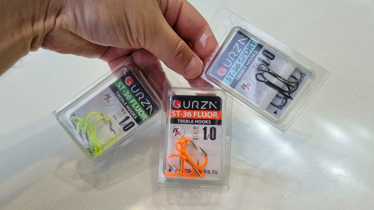 • знаменитые тройники "ST-36" с полимерным покрытием, отражающим ультрафиолетовое излучение с собственными яркими цветами; изготавливаются из высокоуглеродистой нержавеющей стали, по японской технологии, из производимой в Японии же, проволоки; имеют кованое цевье, а особо прочное, игольчатое жало крючка, расположено параллельно ему; полимерное покрытие используется для дополнительного привлечения внимания хищника, максимально эффективно на глубине до четырех метров и выполняет антикоррозийную функцию;