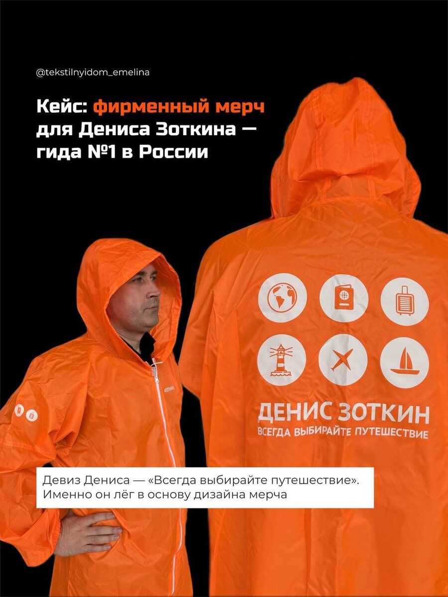 Кейс: фирменный мерч для Дениса Зоткина — гида №1 в России ⛰️ ▪️Задача: создать яркий, запоминающийся и функциональный мерч, который легко узнаётся с первого взгляда, отражает личный стиль и философию Дениса Зоткина, подходит для активного использования в поездках, не пылится в шкафу, а становится частью маршрута и жизни клиента! Наш подход: Каждый заказ мы начинаем не с печати, а с внимательного погружения в контекст клиента: его стиль, целевую аудиторию, цели и практическое применение продукции. Так было и в этом кейсе. Мы предложили качественные и стойкие материалы, идеально подходящие под интенсивную эксплуатацию: яркие дождевики из водоотталкивающей ткани — компактные, удобные в дороге и заметные на любом фоне Обратите внимание, насколько чётко читаются элементы: планета, паспорт, чемодан, маяк, самолёт и парусник — визуальные ассоциации с путешествиями, которые усиливают бренд и делают мерч узнаваемым Для нас важно, а чтобы клиент получил продукт, который будет радовать кажд