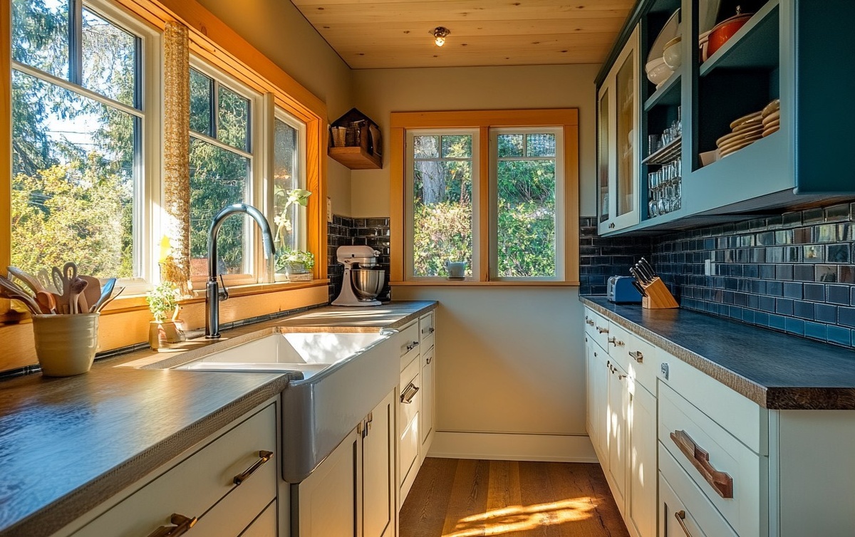 Создано на основе запроса: a realistic DH photograph for interior design publication of a cozy and quaint galley kitchen with two west-facing windows. A sink is below one of the windows. A Caribbean blue hutch is in the far corner. Include warm under cabinet lighting against a dark blue glass tile backsplash. Sunny daylight. --- Автоперевод: Реалистичная фотография DH для дизайна интерьера уютной и причудливой кухни в гамле с двумя окнами, обращенными на запад. Неплохо выглядит? 🤔 https://dzen.ru/id/65c0c65c86e4f837c27b24d7 #ИИ #AI #нейросеть #midjourney #art