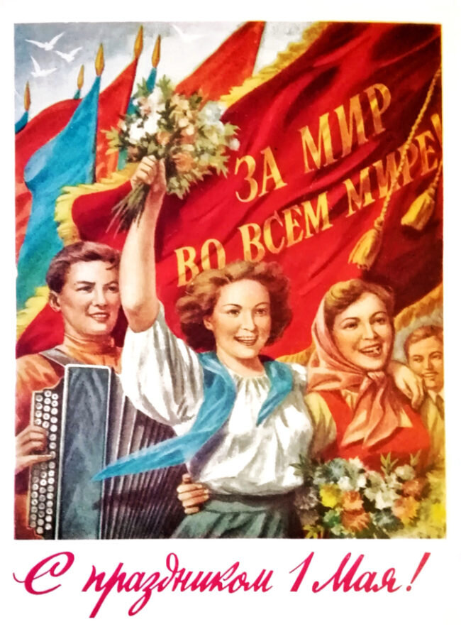 Дорогие читатели, с Первомаем! Сегодня этот праздник ассоциируется с шашлыками и выходными, но для советского человека 1 Мая было куда больше, чем просто красный день календаря. Это был грандиозный спектакль, где каждый знал свою роль: демонстрации с транспарантами, марширующие оркестры, дети с воздушными шарами… А еще — открытки. Те самые, яркие, добрые, с тюльпанами, голубями и улыбающимися трудягами. Давайте пролистаем этот альбом памяти вместе. Праздник начинался задолго до 1 мая. Из гаражей доставали тележки с агитплакатами, штопали знамёна, репетировали шествия. Но главное — открытки. Их закупали пачками в киосках «Союзпечати» и рассылали родным по всей стране. Тиражи были огромными — одни и те же сюжеты кочевали из года в год: Но иногда среди шаблонов проскальзывало неожиданное — например, открытка 1962 года (художник Д. Березовский) с пышной колхозницей, которая скорее готова огреть букетом подвыпившего бригадира, чем нести его в дар партии. В СССР представление о женщине был