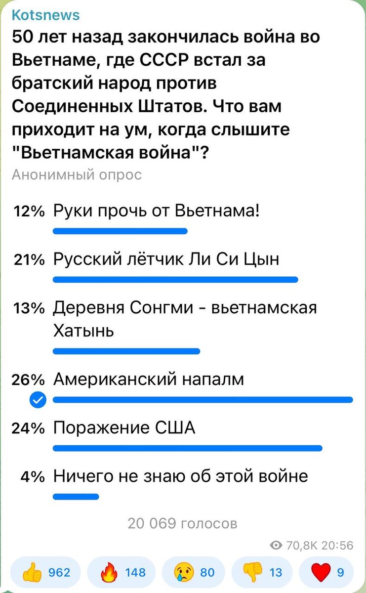 ⚡️⚡️⚡️ Для 26 процентов проголосовавших Вьетнамская война - это в первую очередь полыхающие от напалма джунгли