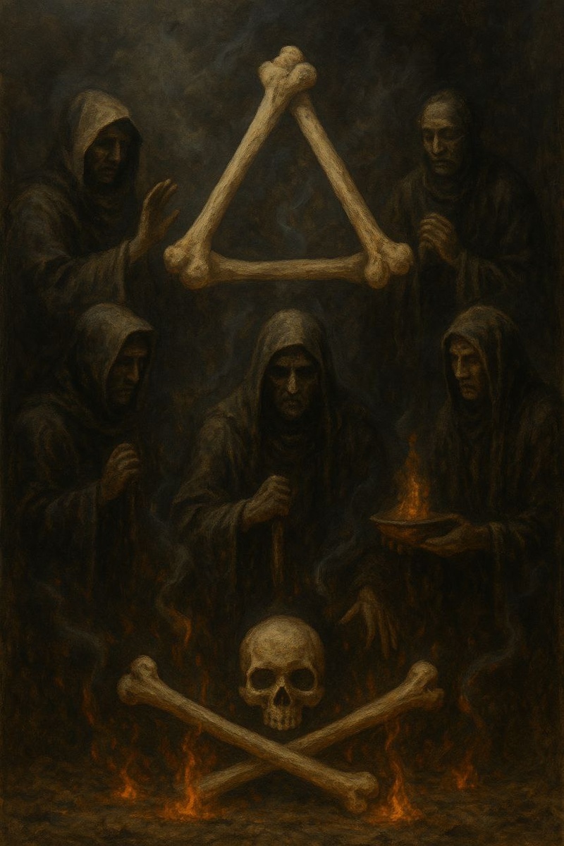Когда пепел ещё знал небо, мёртвых не хоронили — их провожали в огне. Пламя было лестницей, дым — посохом, а прах — обетом, что возвращается в воздух, откуда пришёл дух. Так было, когда знали, что тело — лишь покров, а кость — музыка, сыгранная однажды для звёзд. Но потом пришла земля. Тяжёлая. Молчаливая. И плоть начали класть в глубину. Уже не в пламя, а в черноту. Уже не в прощание, а в ожидание. Так началось поклонение земле как утробе мёртвых. Не земле-Матери, дающей, но земле-Поглотительнице, ждущей возвращения. Кто это принёс? Кто отвёл живых от огня и повёл к могиле? Не имя важно, а замысел: отделить дух от восхождения, запечатать память в глине, лишить кость света. Так возник культ удержания. Не отпускания. Так родилась религия стены между живым и мёртвым. Стали бояться умерших, строить ограды, закрывать землю плитами. Но кость не уходит. Она слышит. И чем глубже зарыта — тем громче зовёт. Захоронение — не просто обычай. Это матрица. Это способ удержать силу в узле,