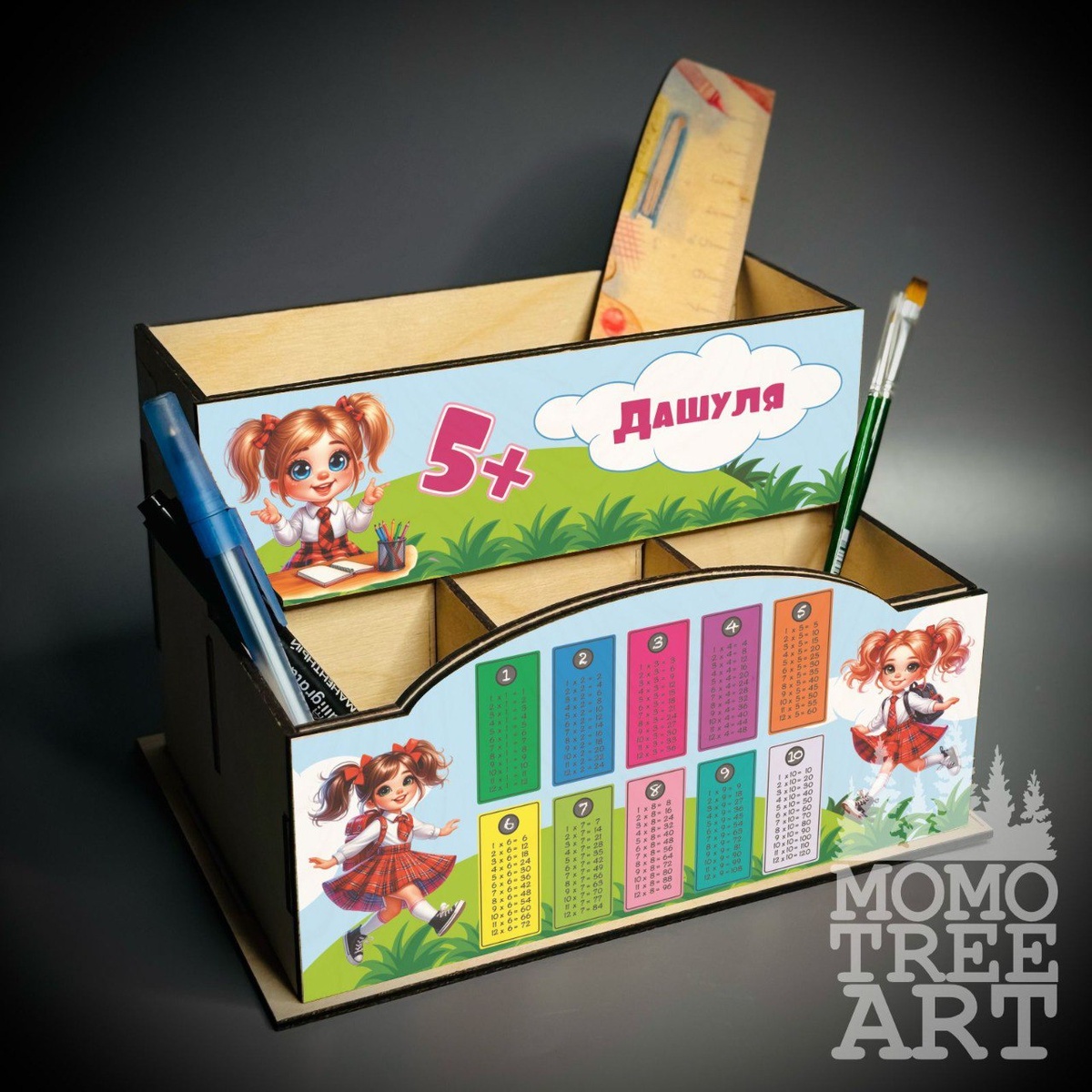 📅 Именной органайзер для школьника - стильный помощник в организации учебного процесса! Деревянная основа (толщина 4 мм) и яркая цветная печать создают не только практичный, но и красивый аксессуар для рабочего стола вашего ребенка. Размер 28х15х14(8) см - идеально подходит для хранения: • Ручек и карандашей • Линейки и ластика • Цветных карандашей Особенности: • Собственное российское производство • Возможность нанесения имени ребенка • Прочная фанера высшего качества • Безопасные материалы • Таблица умножения 🎁 Отличный подарок для первоклассника или любого школьника начальной школы! Поможет ребенку научиться организовывать свое рабочее пространство и поддерживать порядок на столе.