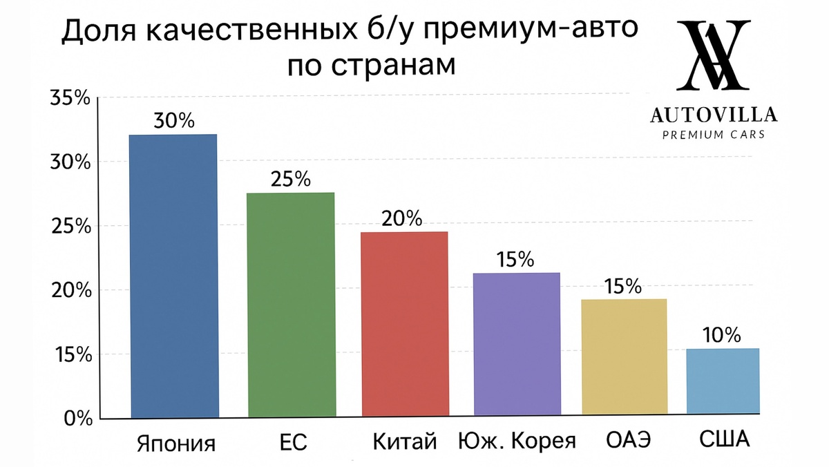 Рисунок: Оценочная доля премиальных подержанных автомобилей, проходящих проверку по ~127 критериям, в зависимости от страны закупки (более высокий процент означает больше шансов найти машину в отличном состоянии). Япония и страны ЕС лидируют по качеству – до четверти или трети таких машин без серьёзных проблем. В ОАЭ и США доля «по-настоящему чистых» авто заметно ниже (≈10–15%), что связано с распространёнными скрытыми дефектами и особенностями местного рынка. Китай и Южная Корея занимают промежуточное положение (в пределах ~15–20% пригодных экземпляров).