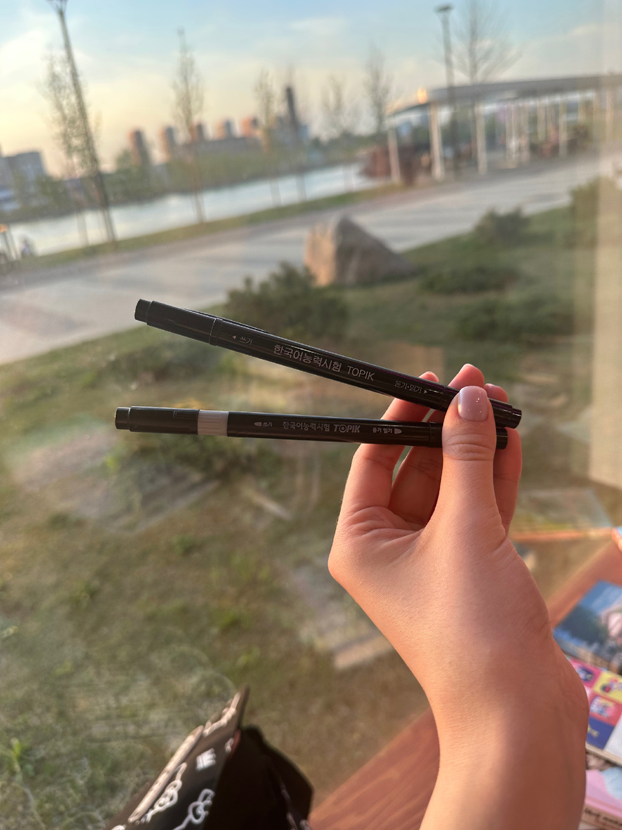 Наверное одна из причин сдавать топик - это специальные ручки, которые выдают на экзамене. После окончания экзамена их можно забрать себе, как сувенир. Я за время изучения корейского пока что собрала вот такую коллекцию из двух ручек. И заодно решила рассказать о своем опыте сдачи двух уровней экзамена, в двух городах. Немного о топике, для тех, кто не знаком с этим экзаменом. TOPIK (Test of proficiency in Korean) - официальный тест, который сдается, чтобы подтвердить уровень владения корейским языком. Он нужен при поступлении в университет в Корее, при трудоустройстве и для получения некоторых виз. Есть всего два уровня экзамена: TOPIK I и TOPIK II. На первом топике можно получить уровни с 1 по 2 (эквивалентны международным А1 и А2). На TOPIK II можно получить уровни с 3 по 6 (с В1 по С2). Состоит из трех разделов: чтение, аудирование и письмо (этот раздел есть только на 2 уровне). Первый топик (TOPIK I) я сдавала в Москве еще осенью 2022 года. Тогда у меня практически не было врем
