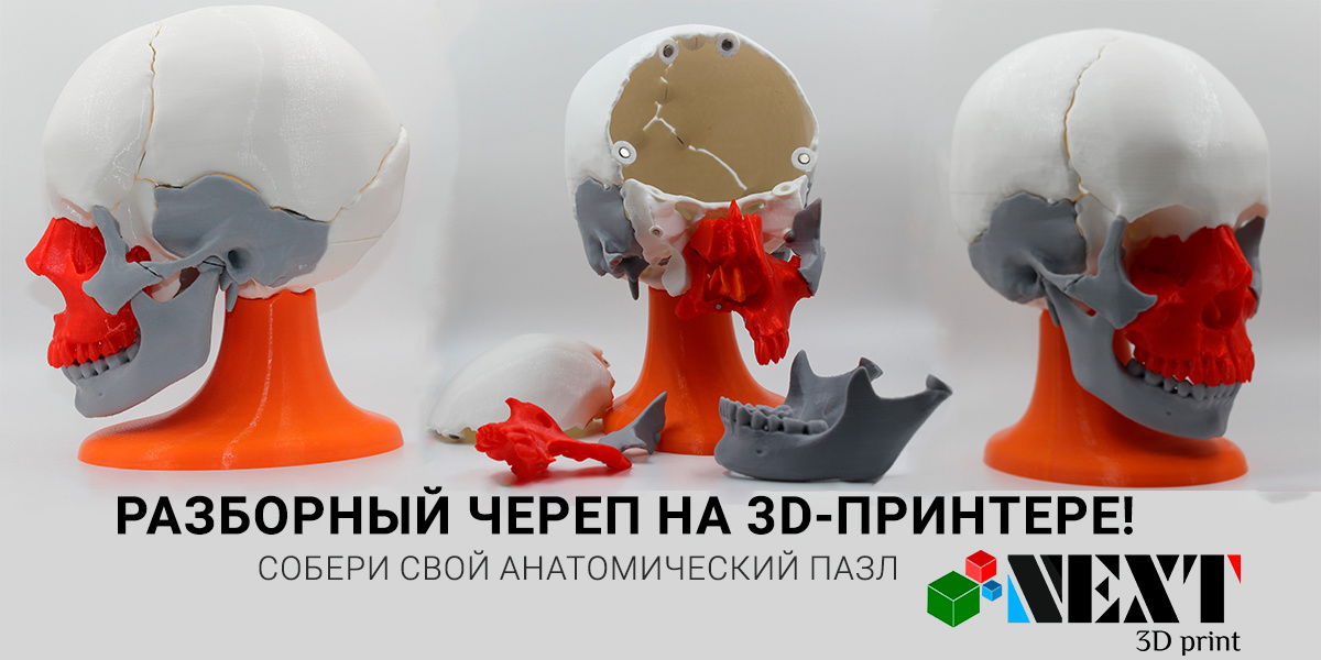 Всех приветсвую! Давно я мечтал замахнуться на что-то эпичное, и вот он — мой проект, который я гордо представляю: разборная анатомическая модель человеческого черепа! Сразу оговорюсь: сам проект я не создавал с нуля, а взял из открытых источников — огромное спасибо умельцам, которые делятся такими крутыми моделями! Моя задача была "всего лишь" воплотить эту идею в реальность с помощью 3D-принтера. И поверьте, это было не менее увлекательно! 😎 Это настоящий анатомический пазл, где каждая косточка черепа воссоздана с ювелирной точностью и скрепляется с другими с помощью магнитов. Представьте: щелк-щелк — и череп собран, как конструктор LEGO, только вместо разноцветных кубиков — скулы, лобная кость и прочие "запчасти" головы. На этот проект у меня ушло полкило пластика — да, я буквально напечатал полкило черепа на 3D-принтере! Вживую модель выглядит просто ошеломительно: полноразмерная, а может, даже чуток больше настоящего черепа. Серьезно, если у кого-то случайно завалялся настоящий ч