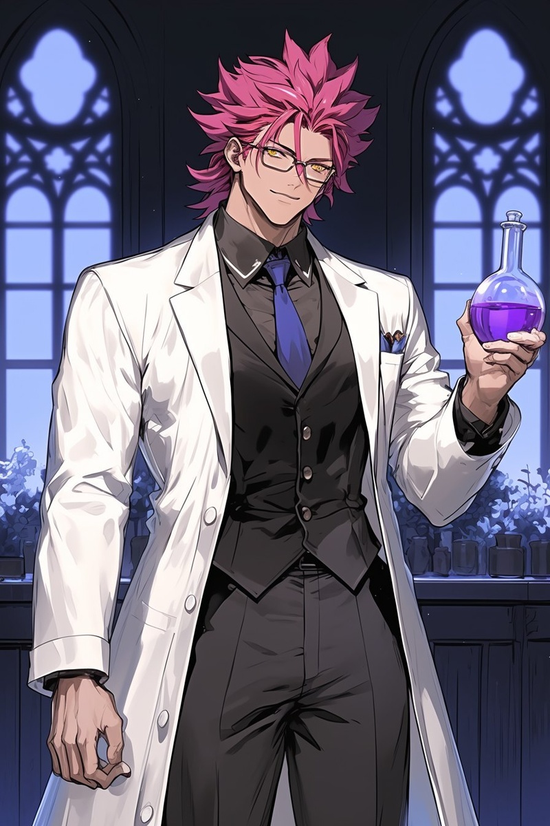 Создано на основе запроса: Full length scientist guy with pink hair and yellow eyes holding a flask with liquid on a beautiful background