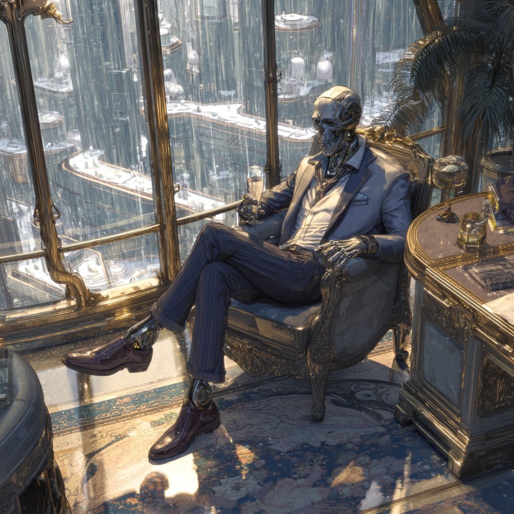 Создано на основе запроса: Full body Shadowrun Undead corpo character illustration, tall and slender looking high ranking corporate worker, CEO vibes, sitting at a luxurious futuristic office at his desk, lots of futuristic luxruious decorations, tall windowed walls, Rainy bladerunner stlye city, Highly detailed 8k fantasy illustration, --- Автоперевод: Полный тел Shadowrun Undead Corpo Иллюстрация персонажа, высокий и тонкий высококачественный корпоративный работник, вибрации генеральных директоров, сидящий в роскошном офисе футуристических Неплохо вышло? 🤔 https://dzen.ru/id/65c0c65c86e4f837c27b24d7 #ИИ #AI #нейросеть #midjourney #art