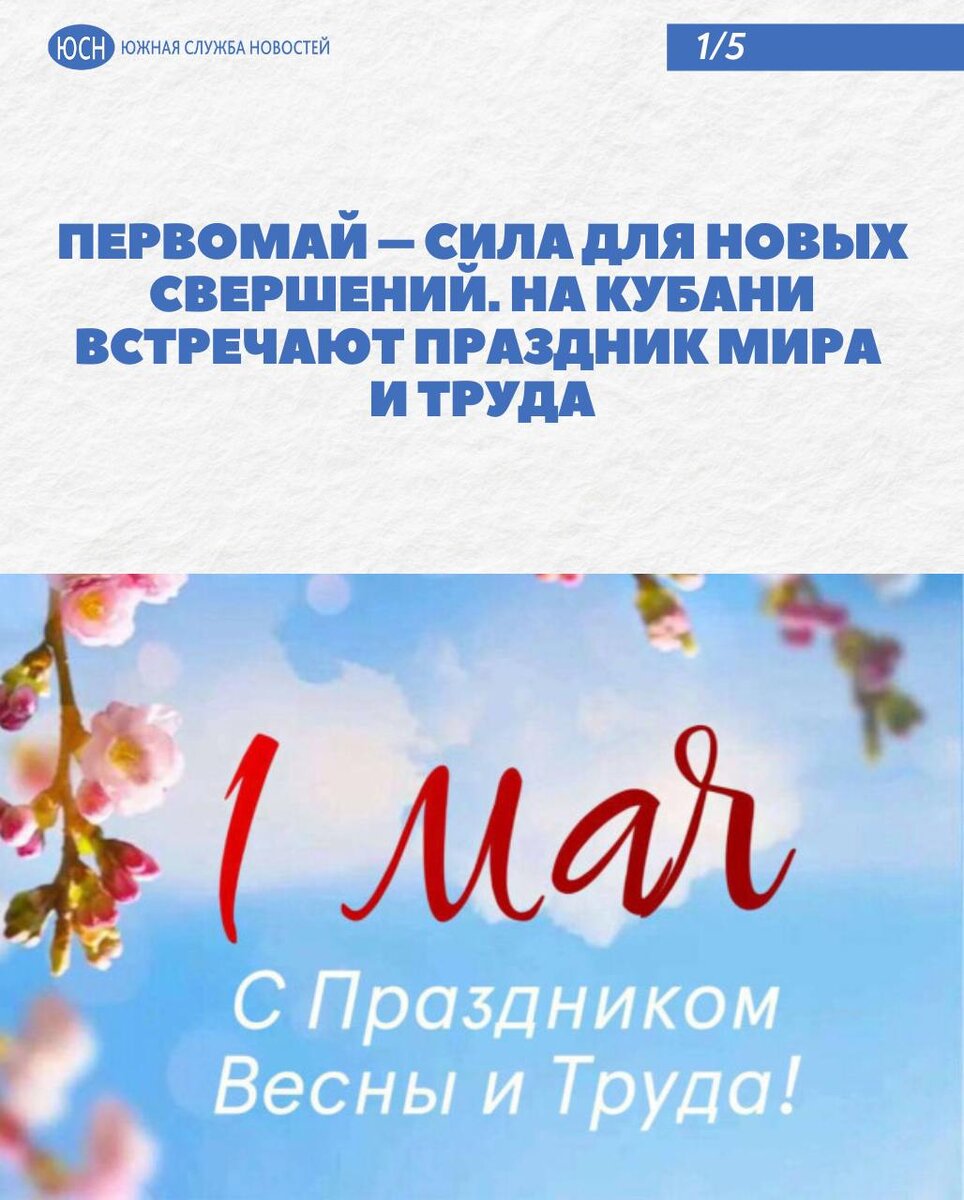 🔹 Первомай – сила для новых свершений. На Кубани встречают праздник мира и труда В Краснодарском крае жителей и гостей ждут концерты, выставки, спортивные мероприятия и развлекательные программы. Глава Кубани Вениамин Кодратьев отметил, что этот всенародный праздник любим с детства. 🌐 Южная служба новостей