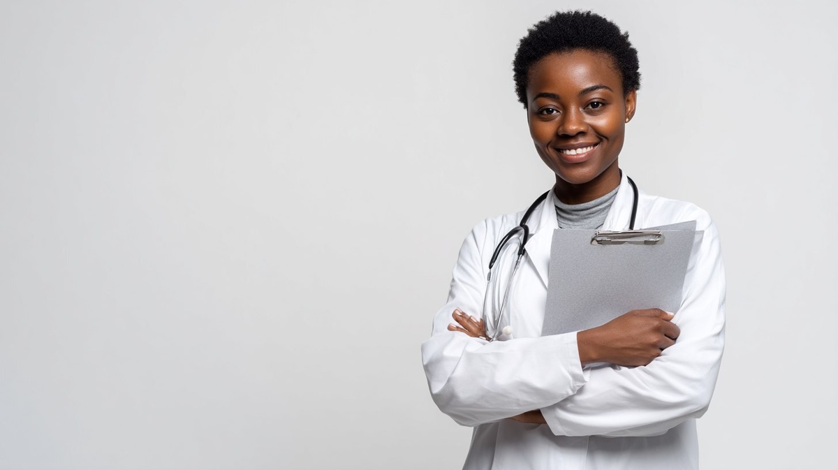 Создано на основе запроса: A professional female doctor smiling confidently, wearing a white lab coat and stethoscope, holding a clipboard