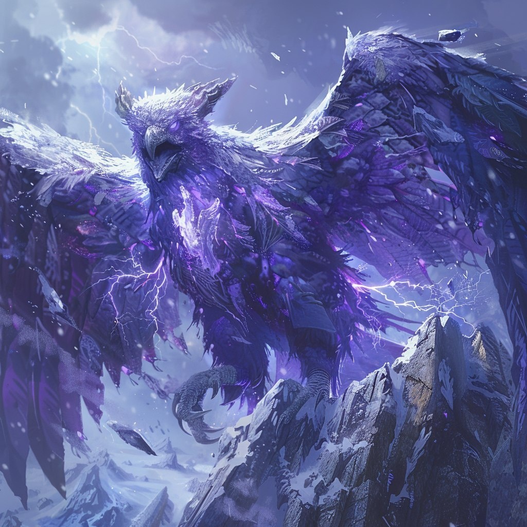 Создано на основе запроса: in the fantasy painted art style of Magic the Gathering, create a monstrous kaiju that’s an undead bird creature with glowing eyes, horns and sharp talons. It’s made of ice and bone. It has purple crystals growing out of it. It perches on a mountain peak over a nest made of broken buildings and ice. Icy snowstorm with lightning. Lower angle view. Cinematic Lighting + Bloom. 4k.
