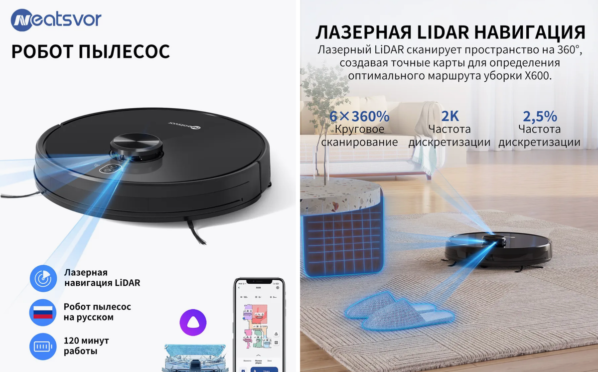 Neatsvor X600 — компактный робот для сухой и влажной уборки. Оснащен лазерной навигацией LiDAR, управляется через приложение, поддерживает голосовые команды Алисы. Подходит для небольших квартир, справляется с пылью, шерстью.