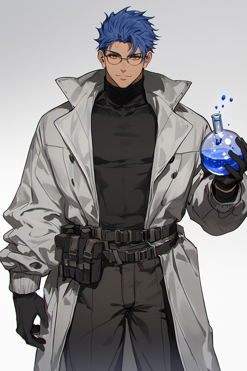 Создано на основе запроса: Full-length scientist guy with blue hair and brown eyes holding a flask with liquid on a beautiful background