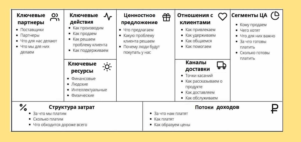✅ Адаптироваться к изменениям — быстро реагировать на смену рынка. Проще говоря, диагностика — это «техосмотр» бизнеса, который покажет, что требует срочного ремонта, а что можно усилить для ускоренного роста. Модель Остервальдера включает 9 блоков: Результат: Полная картина бизнеса, где видны все взаимосвязи. Хорошая бизнес-модель — это слаженный механизм. Если один элемент «хромает», страдает вся система. 🔹 Пример: Вы вкладывает