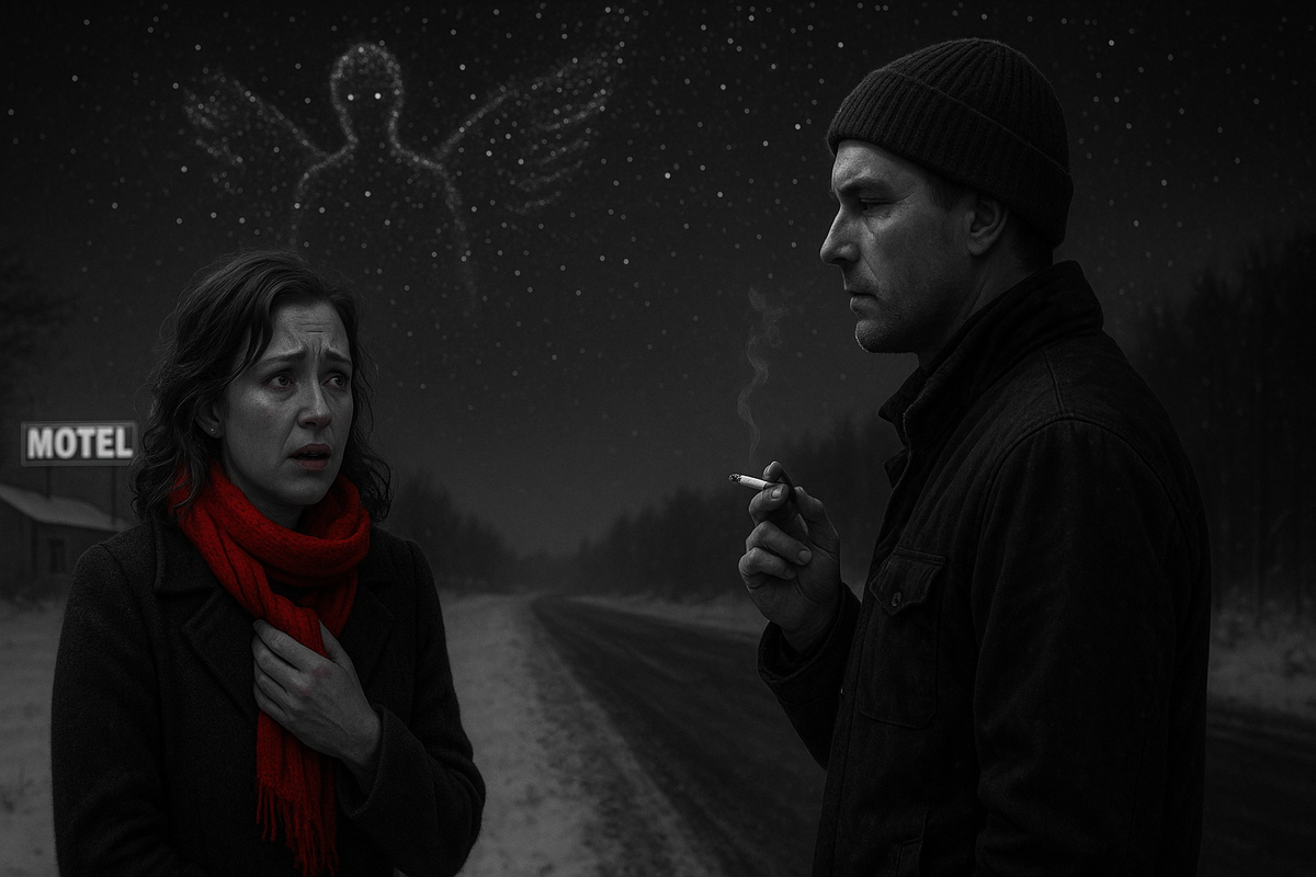 Наконец в безымянном придорожном мотеле, в морозную ночь, она пошла за шарфом. Я сидел, курил, смотрел звёзды. И вдруг они будто сложились в созвездие — безротая фигура, крылья к лицу, колени к груди.