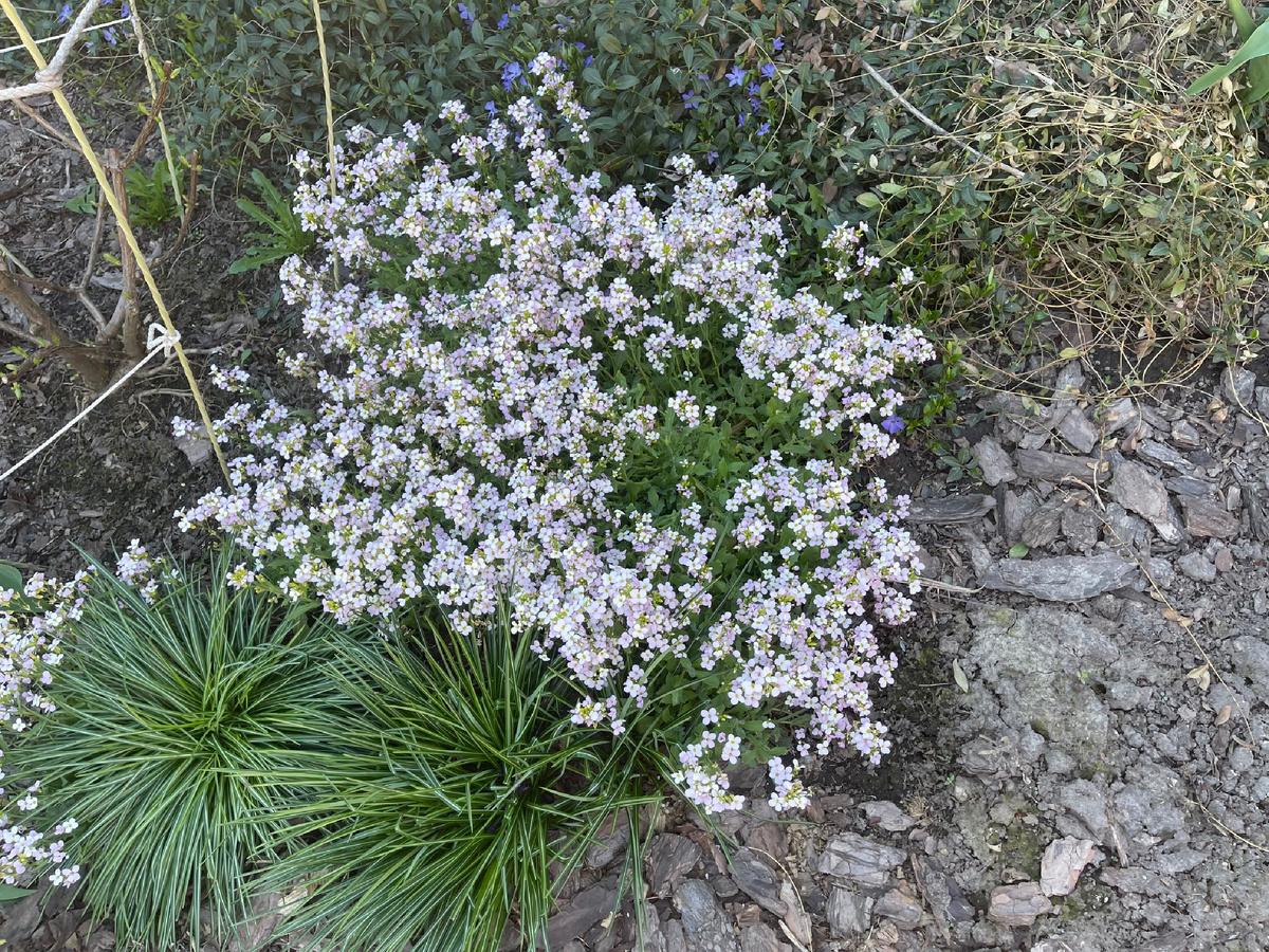 Не так я представляла майские праздники. Ох, не так. В последние годы начало мая всегда было теплым. Хоть в огороде работать. Хоть шашлыки жарить. Хоть просто гулять. Все было комфортно. А в этом году что? Вон в Москве снег выпал. У нас в Курской области снега не было, но и погоды хорошей не было. Солнце выглянет. Шапочку на голову. Теплую жилетку поверх свитера. На ноги меховые сапоги. Только лопату, тяпку взял в руки. Не успел повернуться-развернуться, как тучи снова набежали. Ветер деревья гнет к земле. Дождь начинает хлестать по пятой, вверх поднятой точке. Скатываться по жилетке и заливаться за ворот. Так дождь гонял меня отдыхать. Только зайду в дом, только хлебну кофею, а солнце снова вышло из-за туч. Вот таким был первый день мая. Чем встречает мой сад Первомай? А давайте покажу. 📍Арабис. Его показывала еще а апреле. Только тогда он назывался у меня алиссумом. Внимательные читатели заметили подлог и подмену названий. Теперь это арабис. 📍Бадан. Пока скромненько выпускает н